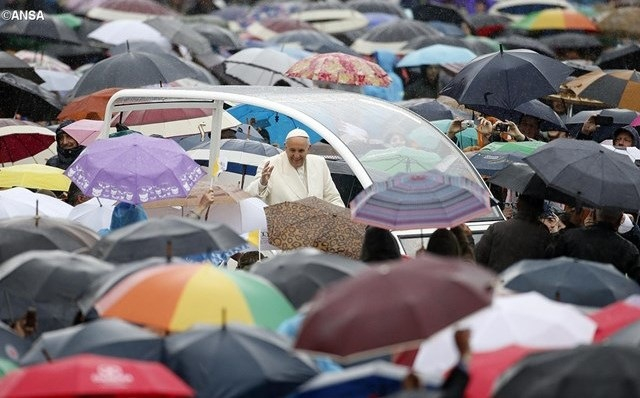 Jó napot! Bár nincs valami szép napunk, ugye? Ma a kihallgatást két különböző helyen tartjuk – mindig így csináljuk, amikor esik az eső –, ti itt, a téren, sok beteg pedig a VI. Pál-teremben, ők kivetítőkön követik a kihallgatást. A testvériség jeleként köszöntsük őket tapssal! Ugye, nem is könnyű esernyővel a kézben tapsolni?
